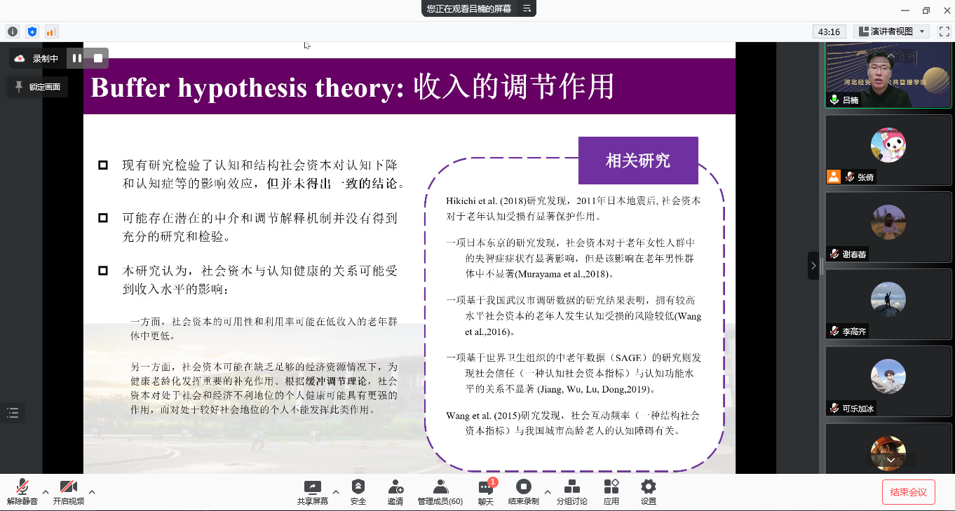 吕楠围绕健康老龄化视域下农村老年人照护社会资本整合,以及老年人认知能力和精神健康聚焦我国农村地区老年人口社会资本与认知功能的关系。并基于主持的国家社科重点项目调研数据师生们介绍我国农村地区老年人口社会资本、社区环境与精神健康的关系研究。最后阐述了在乡村振兴和城乡公共服务均等化进程中,农村老年人的养老需求、社会资本特点以及社会服务的可行性路径。