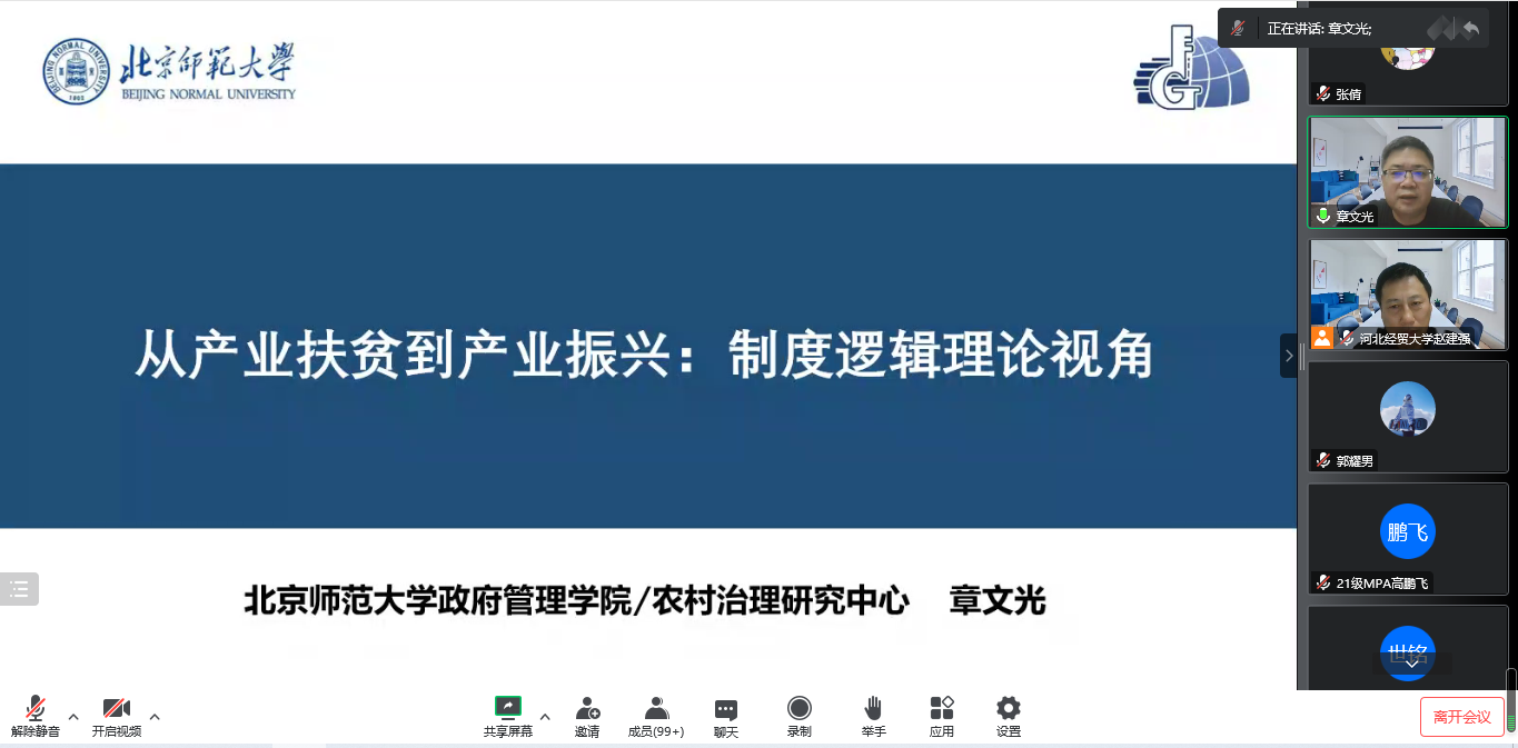 2022年10月24日,北京师范大学政府管理公司经理、国家级人才计划入选者、全国公共管理专业学位研究生教育指导委员会委员、教育部公共管理类专业教学指导委员会委员章文光教授应伟德国际victor1946邀请,通过腾讯会议作题为“从产业扶贫到产业振兴:制度逻辑视角”的学术讲座。本次讲座由伟德国际victor1946经理赵建强教授主持,公司师生共300余人参加。