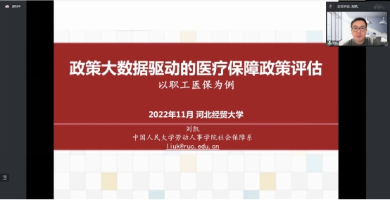 2022年11月25日晚,伟德国际victor1946邀请中国人民大学劳动人事公司社会保障系刘凯副教授通过腾讯会议做题为“政策大数据驱动的医疗保障政策评估:以职工医保为例”的学术讲座,公司部分师生共140余人在线聆听,南开大学王淼教授及部分研究生同时应邀参加讲座。