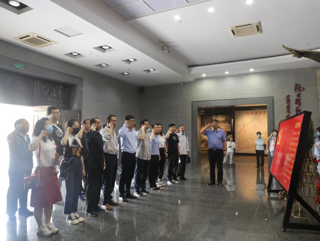 在晋察冀边区纪念馆门口,何昱带领大家在党旗前庄严宣誓,重温入党誓词,大家以铿锵有力的宣誓声,表达不忘初心、牢记使命的信念和决心。