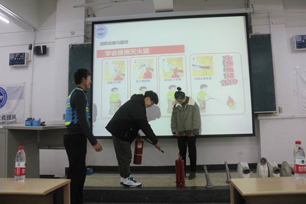 讲座伊始,李星辰通过讲解几个校园火灾案例,为同学们敲响校园火灾警钟。随后,李星辰从认识燃烧与火灾、消防设施与器材、火灾扑救与防范、火场逃生与疏散四个方面为大家作讲解,介绍防火基本知识的同时还教授了许多同学们未了解过的关于救火、逃生的技能。其中,在“消防设施与器材”这一方面,他介绍了常规消防设施的使用,并现场演示了报警器、灭火器和甩水带的正确使用方法,让同学们亲身体验如何使用灭火器,使同学们对灭火器材的使用有了更直观的了解。最终的答疑环节,同学们就不懂之处积极提问,李星辰认真耐心作答,他与同学们的积极互动增加了同学们对消防安全更深层次的认识。